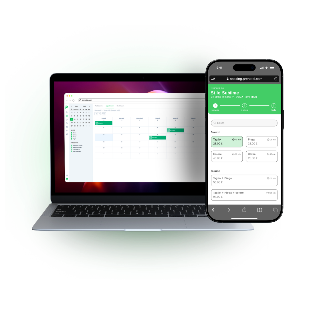 ll vantaggio per te: ottimizzi al massimo la capacità del tuo studio. L’IA gestisce prenotazioni multiple in contemporanea, assegna i clienti ai collaboratori disponibili e calcola automaticamente la durata corretta per ogni combinazione di servizi, eliminando errori di sovrapposizione.